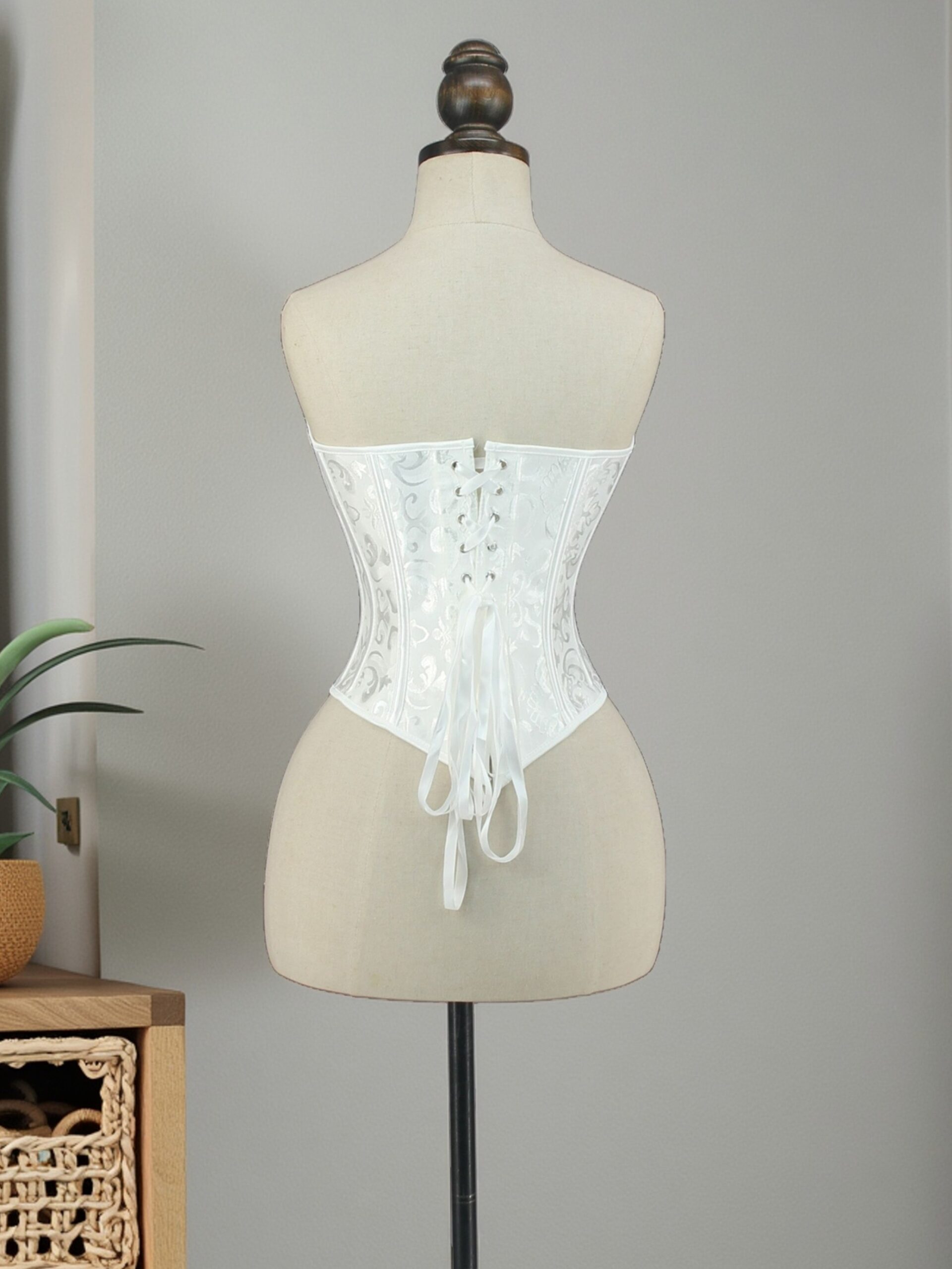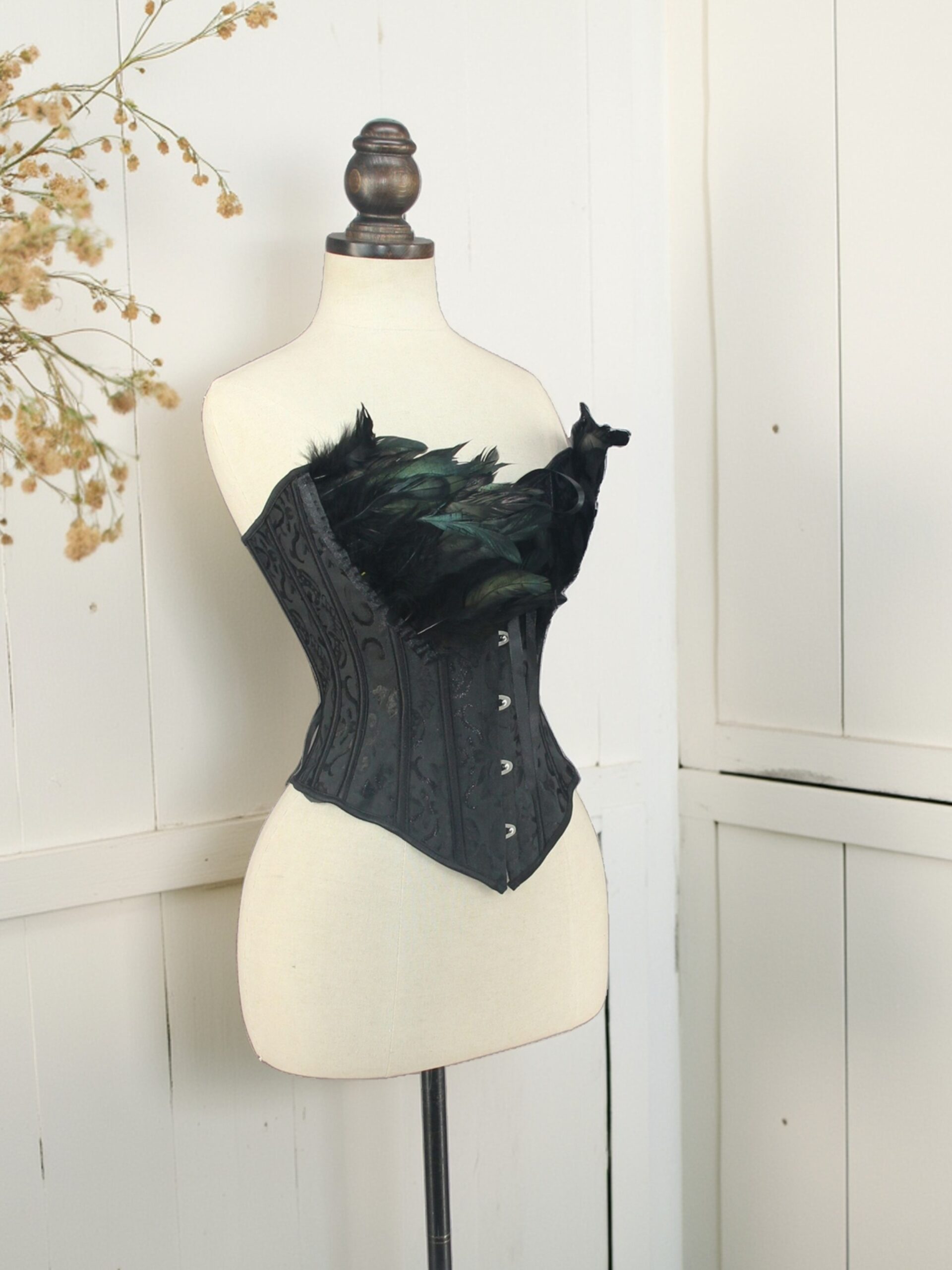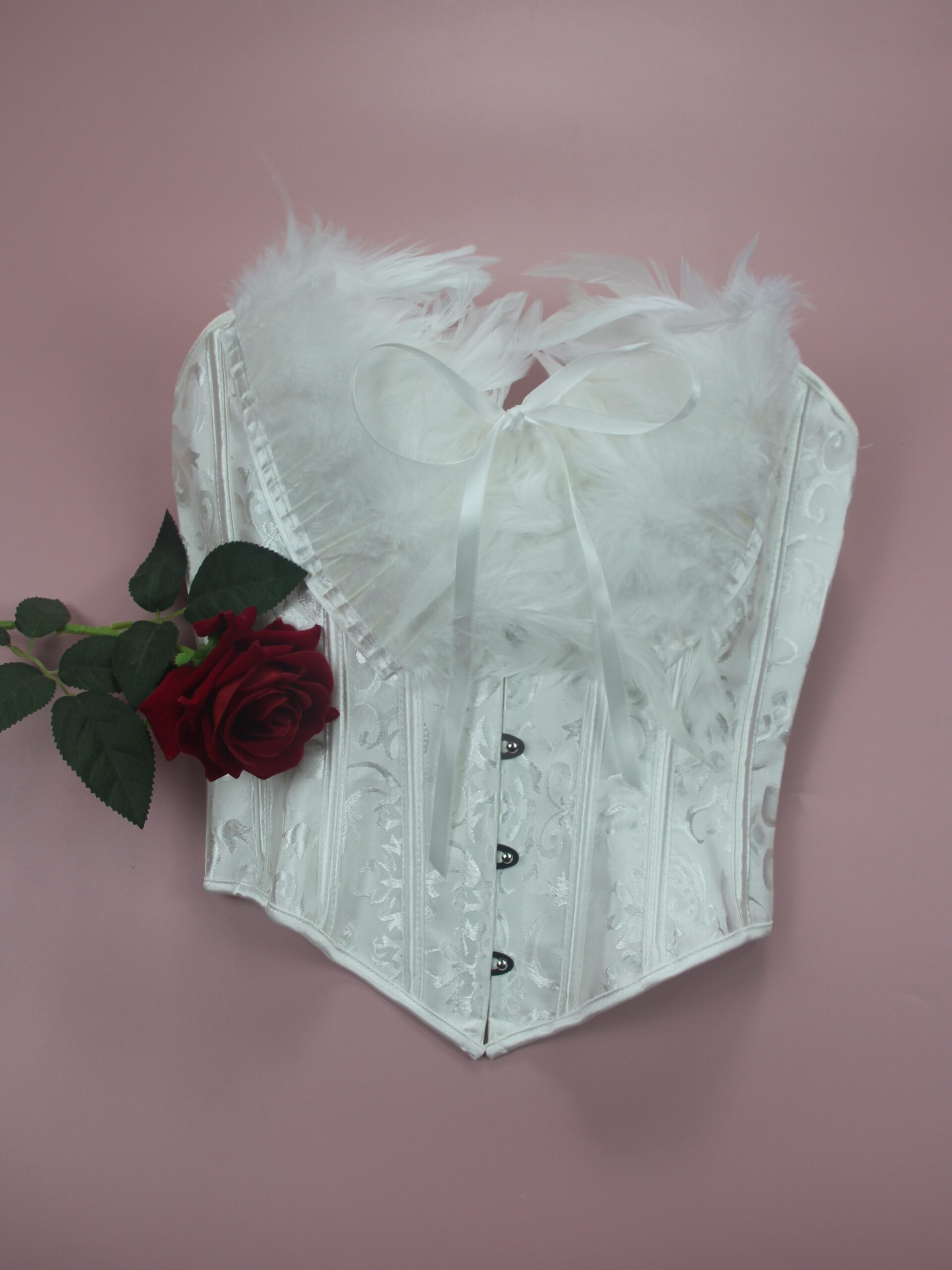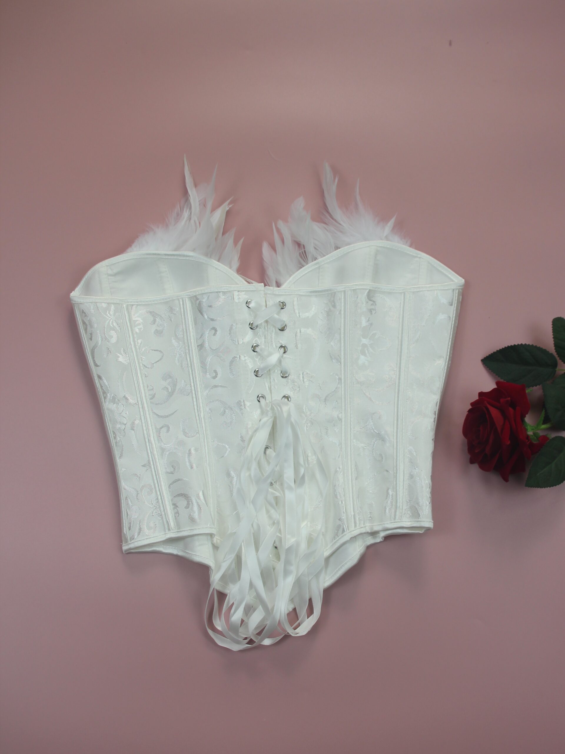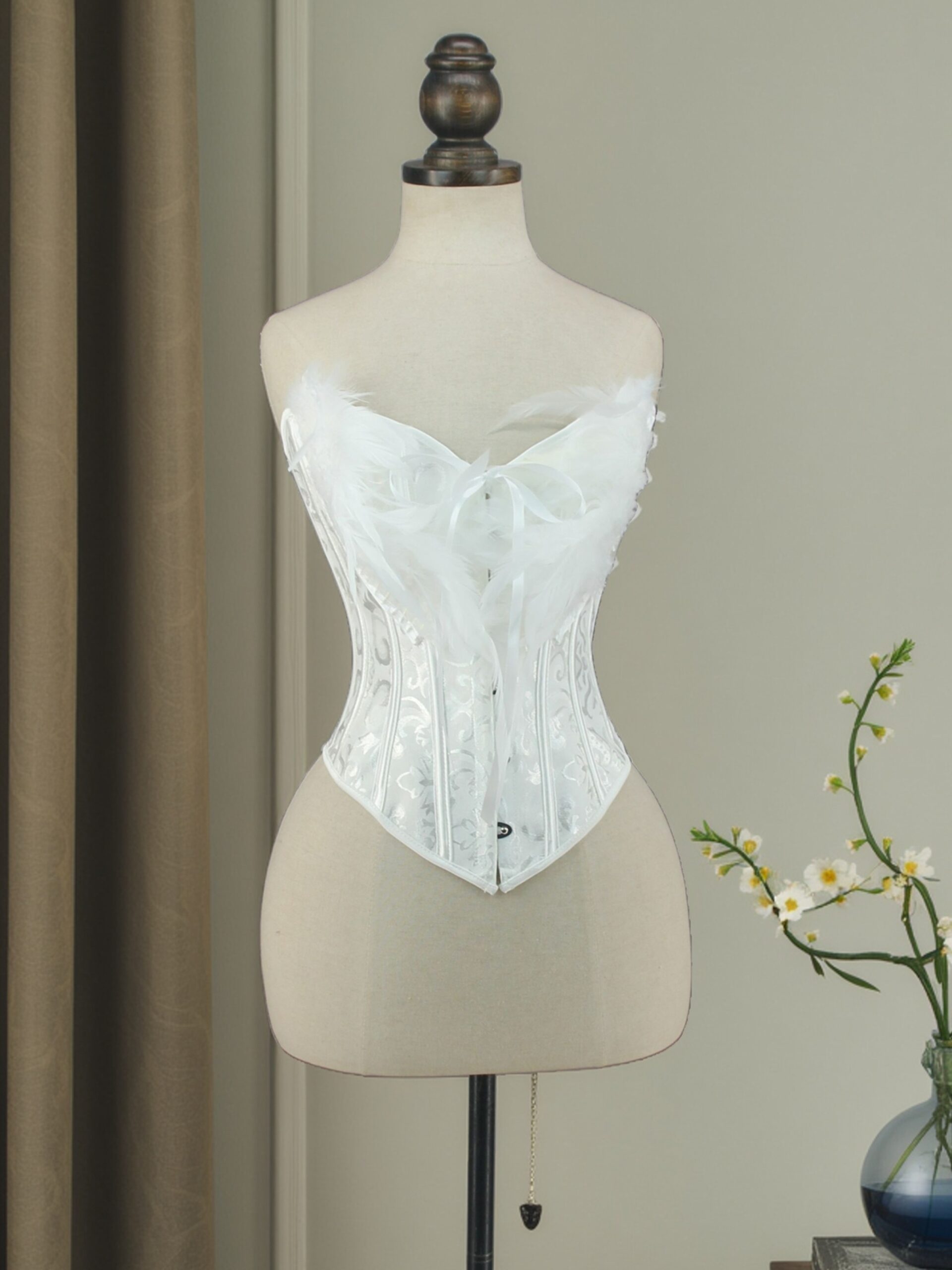 - Style: Elegant strapless corset with feather-trimmed sweetheart neckline