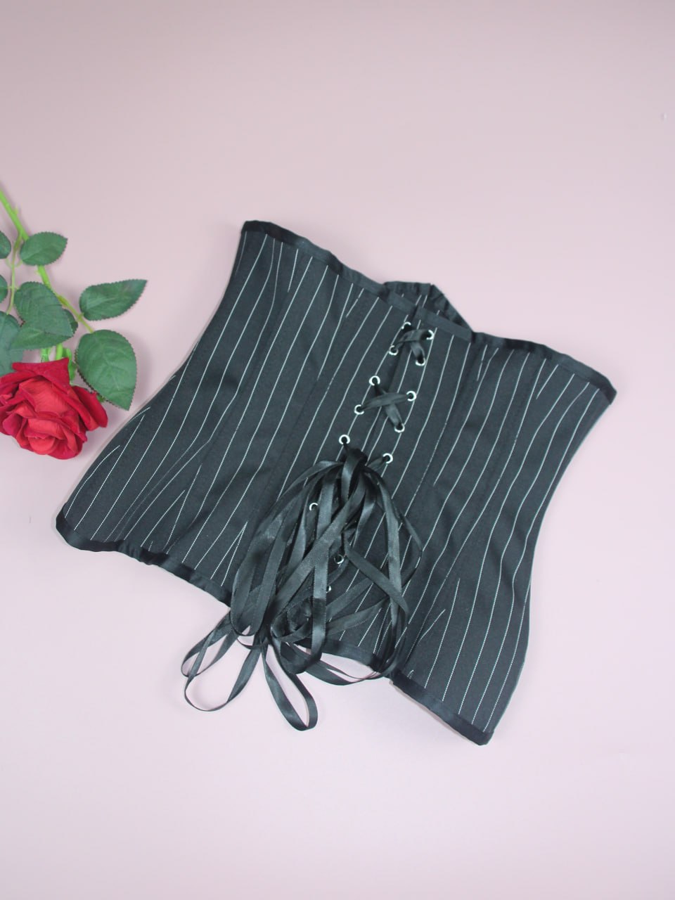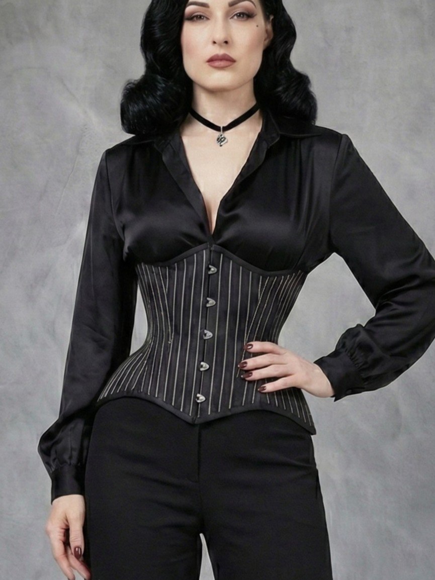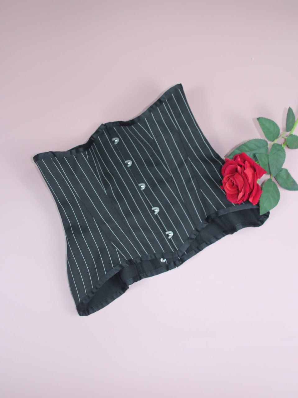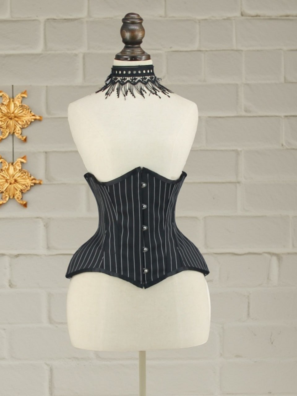 Upgrade your collection with our 2612 steel-boned underbust corset top, designed to shape the waist while keeping the look clean and elegant. The black pinstripe fabric pairs easily with skirts, shirts, and dresses for a refined gothic or steampunk silhouette.