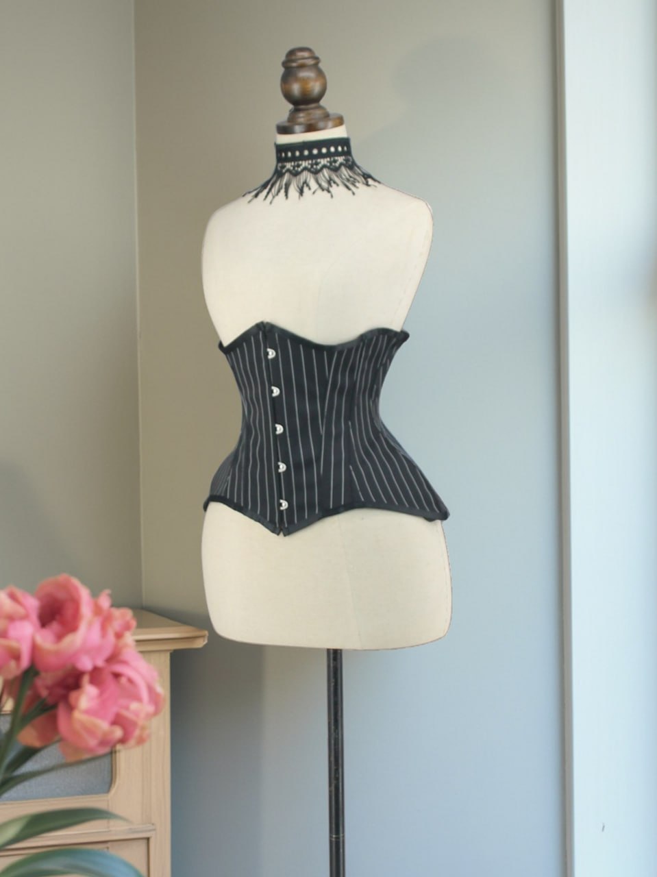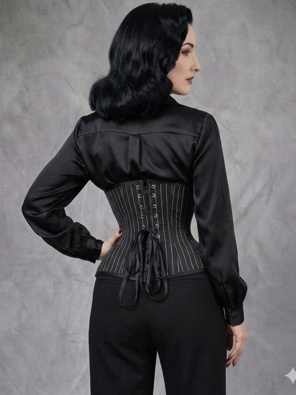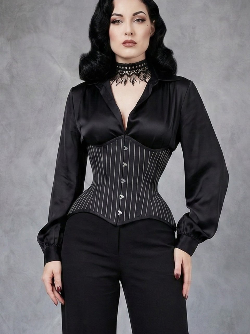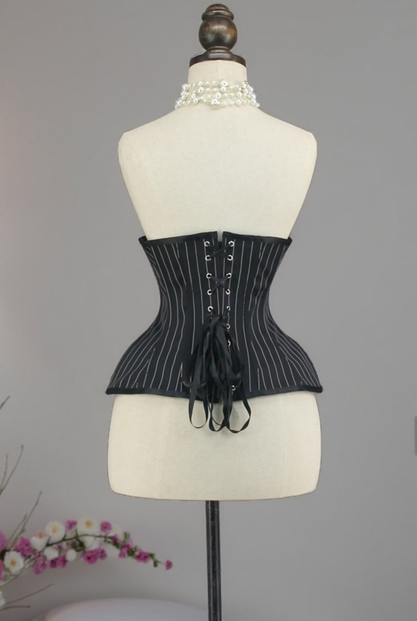 Upgrade your collection with our 2612 steel-boned underbust corset top, designed to shape the waist while keeping the look clean and elegant. The black pinstripe fabric pairs easily with skirts, shirts, and dresses for a refined gothic or steampunk silhouette.
